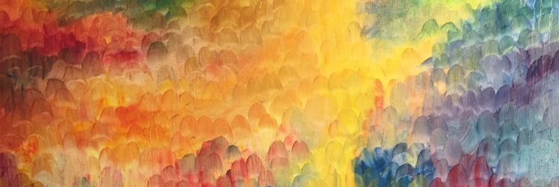 Jubilate Deo: Be Joyful in the Lord! When I was a girl, my family faithfully attended St. Thomas Episcopal Church. My earliest memories of art and music, celebration and contemplation, are deeply rooted in the rich history of the liturgy. The poetry of the Psalms and prayers still resonates in my heart. This painting expresses the vibrancy and delight of singing Psalm 100, also called the Jubilate Deo: “Be joyful in the LORD all ye lands, and come before His presence with a song.” With lively colors my heart still sings and dances with joy before the Lord my Maker. (Jubilate Deo, oil on canvas, 30″ x 40″)![]()